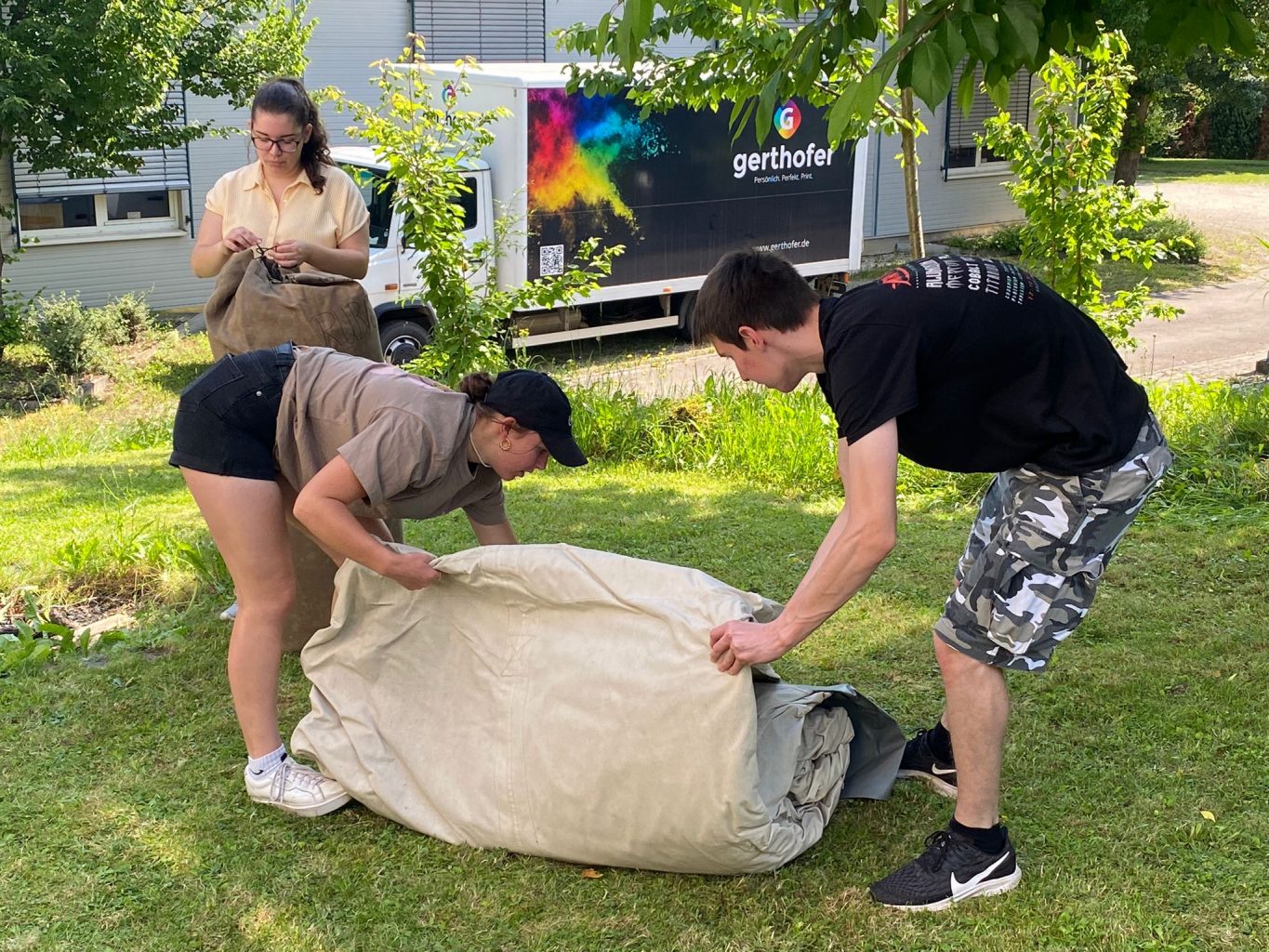 Nacht gut zwei Stunden war diese Arbeit erledigt. Danach ging es direkt weiter zur Dobelmühle, um dort vier unserer SG20 Zelte aufzubauen. Bei bestem Wetter waren wir damit 45 Minuten beschäftigt. Nach einem „Eis aufs Haus“ ging es dann wieder zurück zum Jugendwerk. Mit Wurst im Wecken haben wir dann die diesjährige Zeltinventur und den Aufbau fürs Konficamp beendet.
