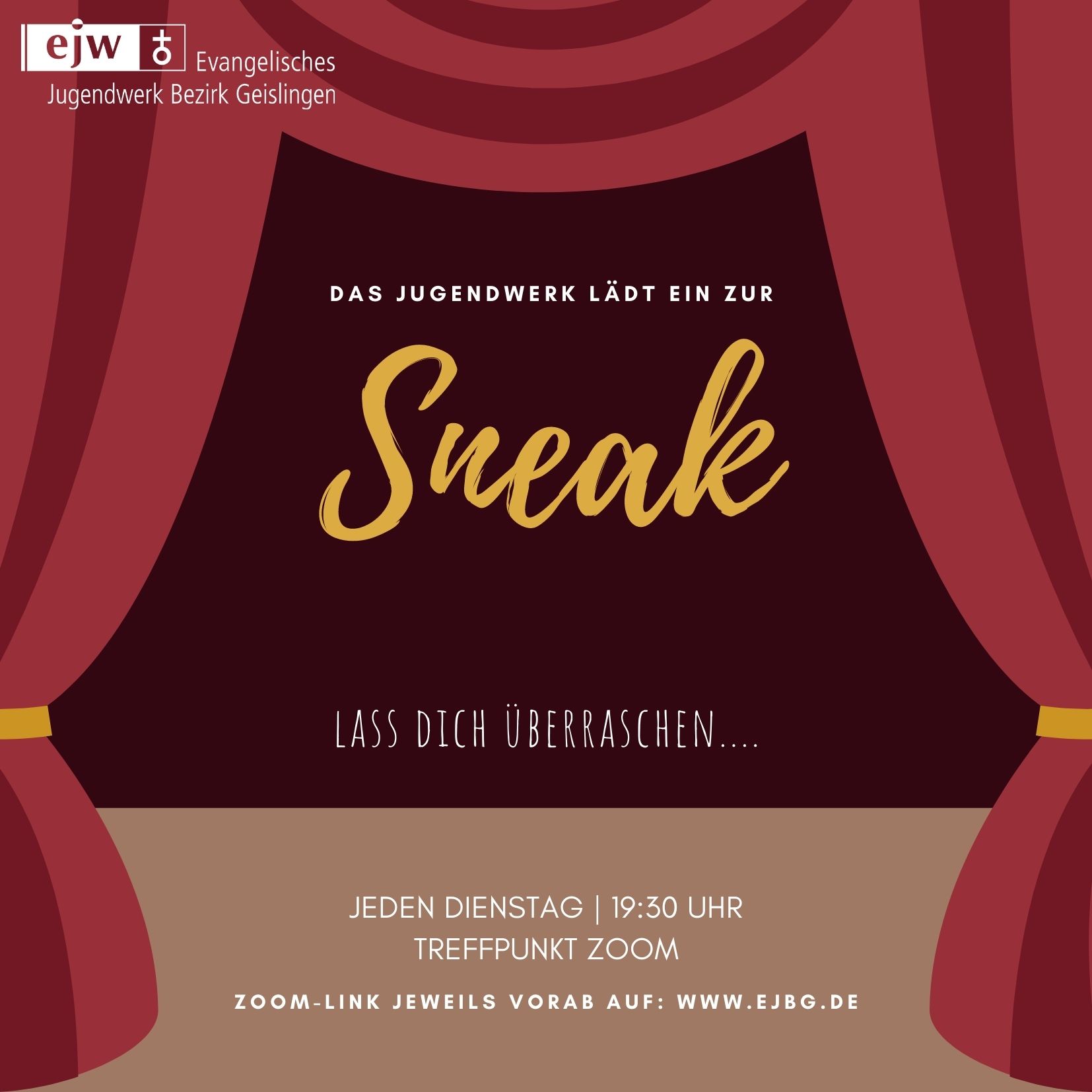 Immer noch können wir keine Gruppenstunden vor Ort durchführen, das ist schade. Stattdessen bieten wir euch aber nun ein neues Format: SNEAK Jeden Dienstag Abend ab 19:30 Uhr bist du